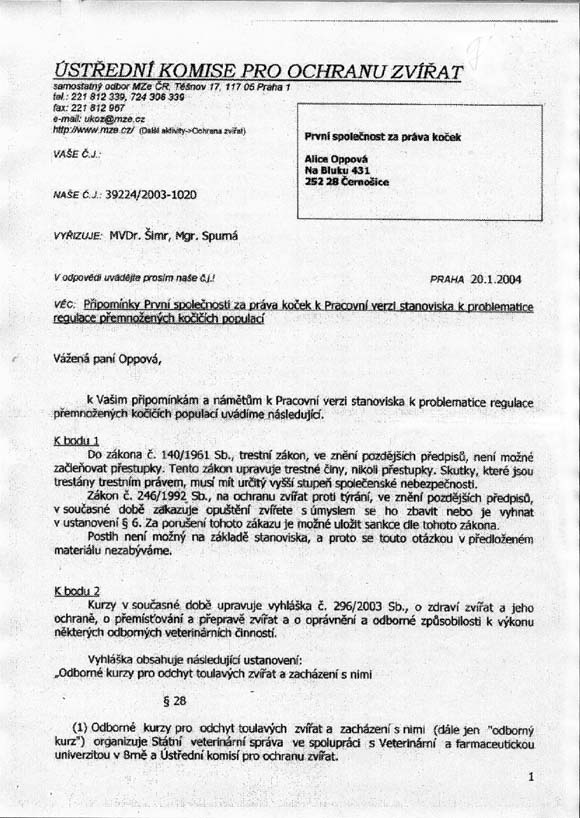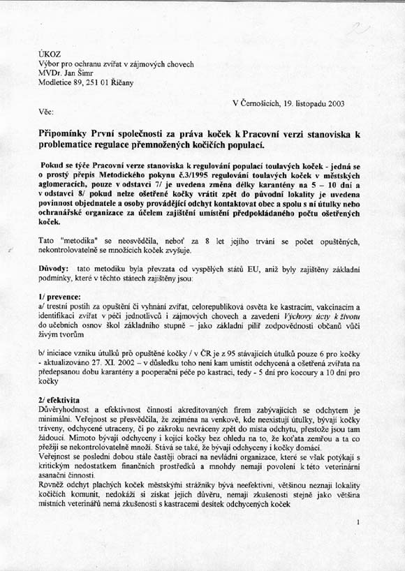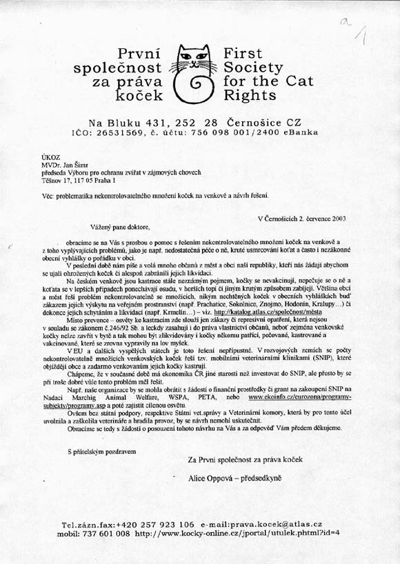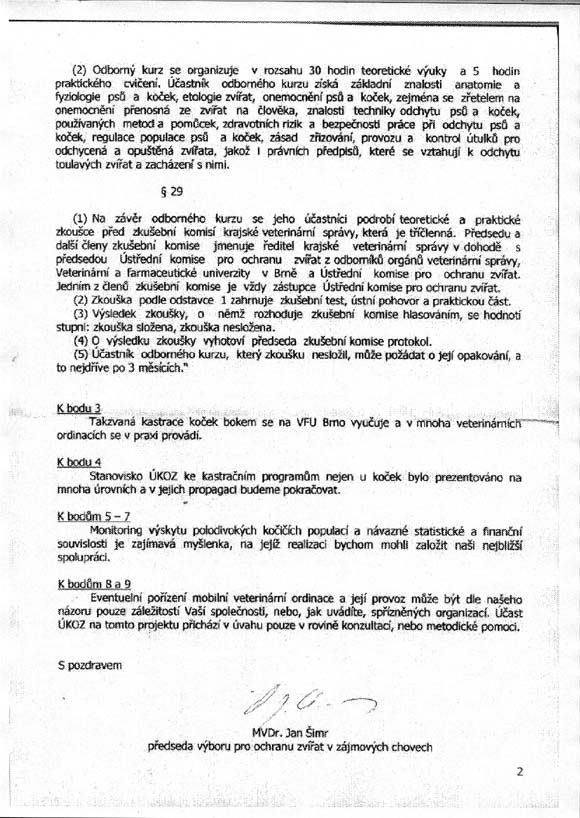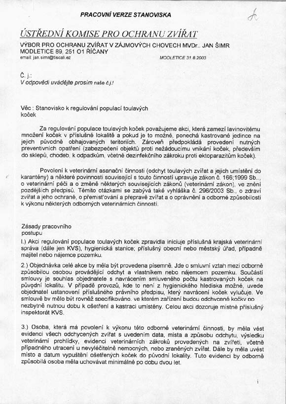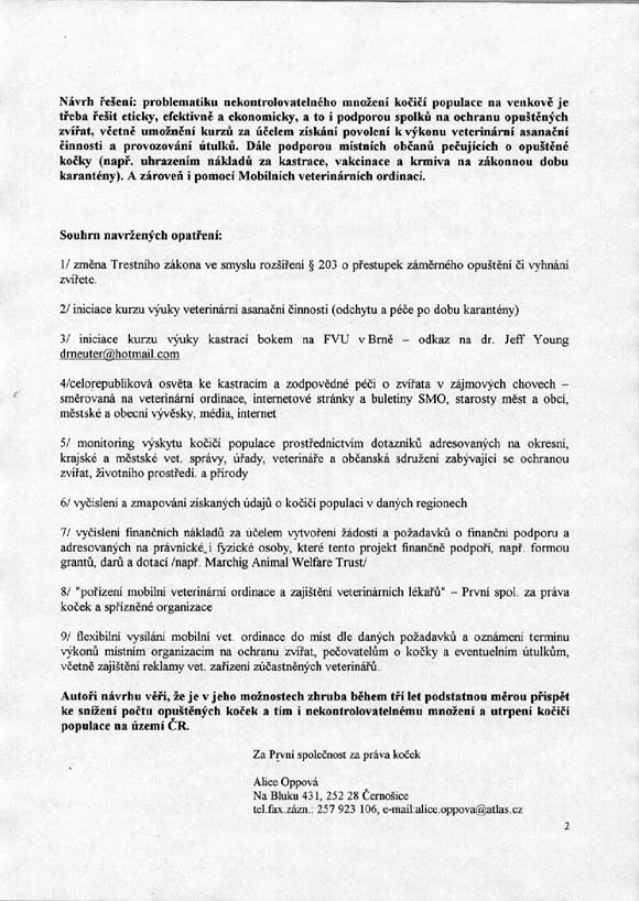 2/ Zaslání žádosti o spolupráci s Ministerstvem zemědělství ČR na vytváření metodiky zahrnující kastraci koček jako obranu proti jejich přemnožení a následnému týrání ze strany lidí na sekretariát Mze ČR – střešní orgán ochrany zvířat a připomínky k Pracovní verzi stanoviska ÚKOZ k problematice regulace přemnožených kočičích populací /viz. příloha/ 3/ Zaslání žádosti o podporu tohoto řešení ze strany jednotlivých měst a obcí na Svaz měst a obcí ČR a dohoda o umožnění osvěty na webu Svazu měst a obcí.
