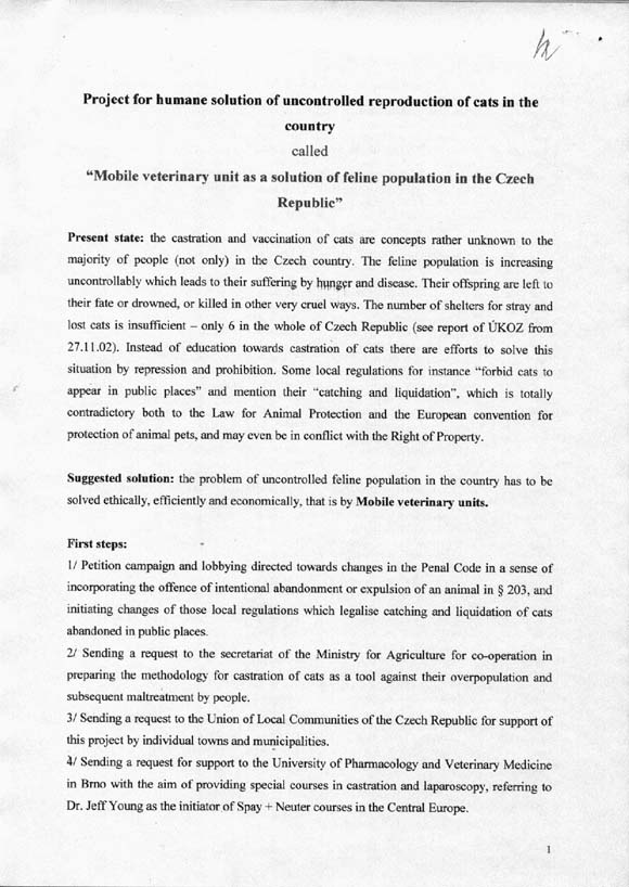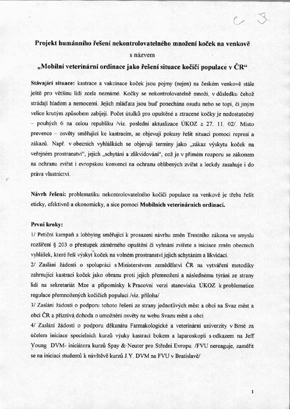 V souvislosti se stále častějšími stížnostmi občanů na nezájem obcí v řešení problematiky opuštěných koček a strmým nárůstem kočičí populace, nás koncem června 2003 napadlo iniciovat Projekt mobilních veterinárních ordinací, které by zadarmo kastrovaly kočky. Obrátili jsme se tedy nejprve na ÚKOZ – Výbor pro ochranu zvířat v zájmových chovech a po zdánlivě příznivé odpovědi následovaly další kroky: