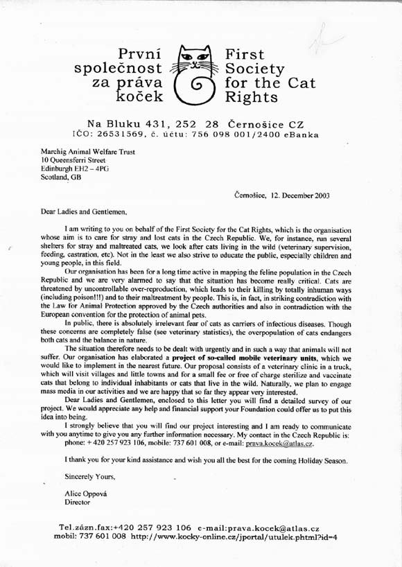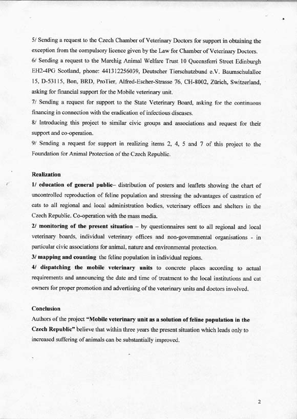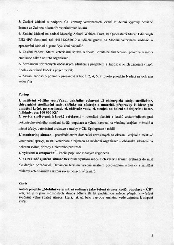 překlad a odeslání Projektu žádosti o grant na mobilní vet. ordinaci Nadaci Marchig Animal Welfare Trust.