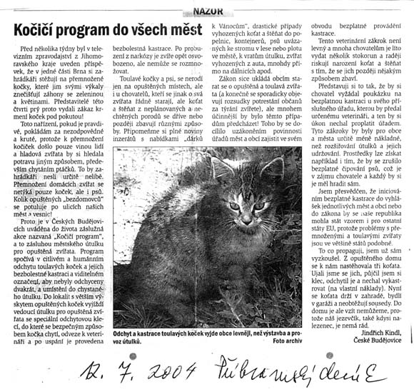 kastrace a vakcinace koček jsou pojmy (nejen) na českém venkově stále ještě pro většinu lidí zcela neznámé. Kočky se nekontrolovatelně množí, v důsledku čehož strádají hladem a nemocemi. Jejich mláďata jsou buď ponechána osudu nebo se topí, či jiným velice krutým způsobem zabíjejí. Počet útulků pro opuštěné a ztracené kočky je nedostatečný – pouhých 6 na celou republiku /viz. poslední aktualizace ÚKOZ z 27. 11. 02/. Místo prevence – osvěty směřující ke kastracím, se objevují pokusy řešit situaci pomocí represí a zákazů. Např. v obecních vyhláškách se objevují termíny jako „zákaz výskytu koček na veřejném prostranství“, jejich „schytání a zlikvidování“, což je v přímém rozporu se zákonem na ochranu zvířat i evropskou konvencí na ochranu oblíbených zvířat a leckdy zasahuje i do práva vlastnictví.