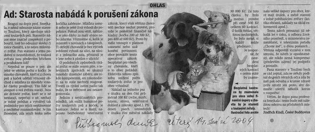 Přestupkové komise městských úřadů to nepostihují, přestože zákon č. 246/92 Sb., opuštění či vyhnání zvířete nebo jeho usmrcení způsobem působícím nepřiměřenou bolest považuje za týrání zvířat.